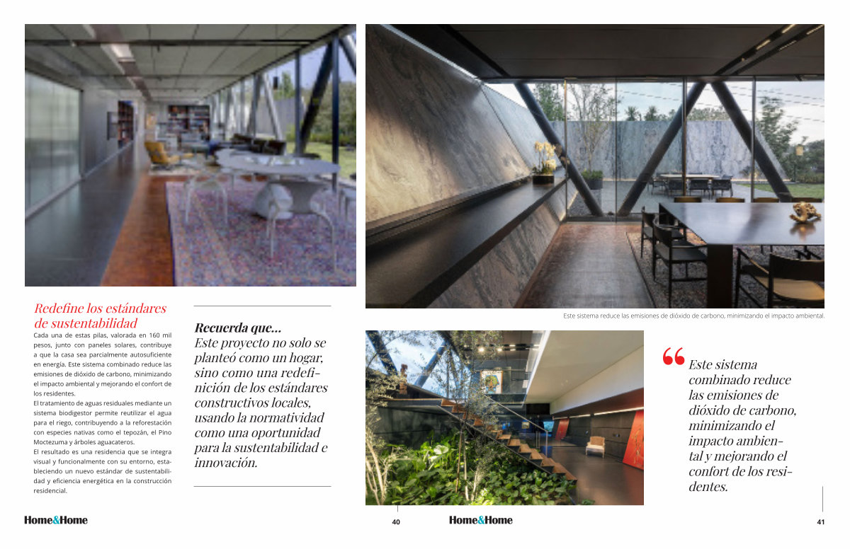 Cada una de estas pilas , valorada en 160 mil pesos , junto con paneles solares , contribuye a que la casa sea parcialmente autosuficiente en energía . Este sistema combinado reduce las emisiones de dióxido de carbono , minimizando el impacto ambiental y mejorando el confort de los residentes . El tratamiento de aguas residuales mediante un sistema biodigestor permite reutilizar el agua para el riego , contribuyendo a la reforestación con especies nativas como el tepozán , el Pino Moctezuma y árboles aguacateros . El resultado es una residencia que se integra visual y funcionalmente con su entorno , estableciendo un nuevo estándar de sustentabilidad y eficiencia energética en la construcción residencial .