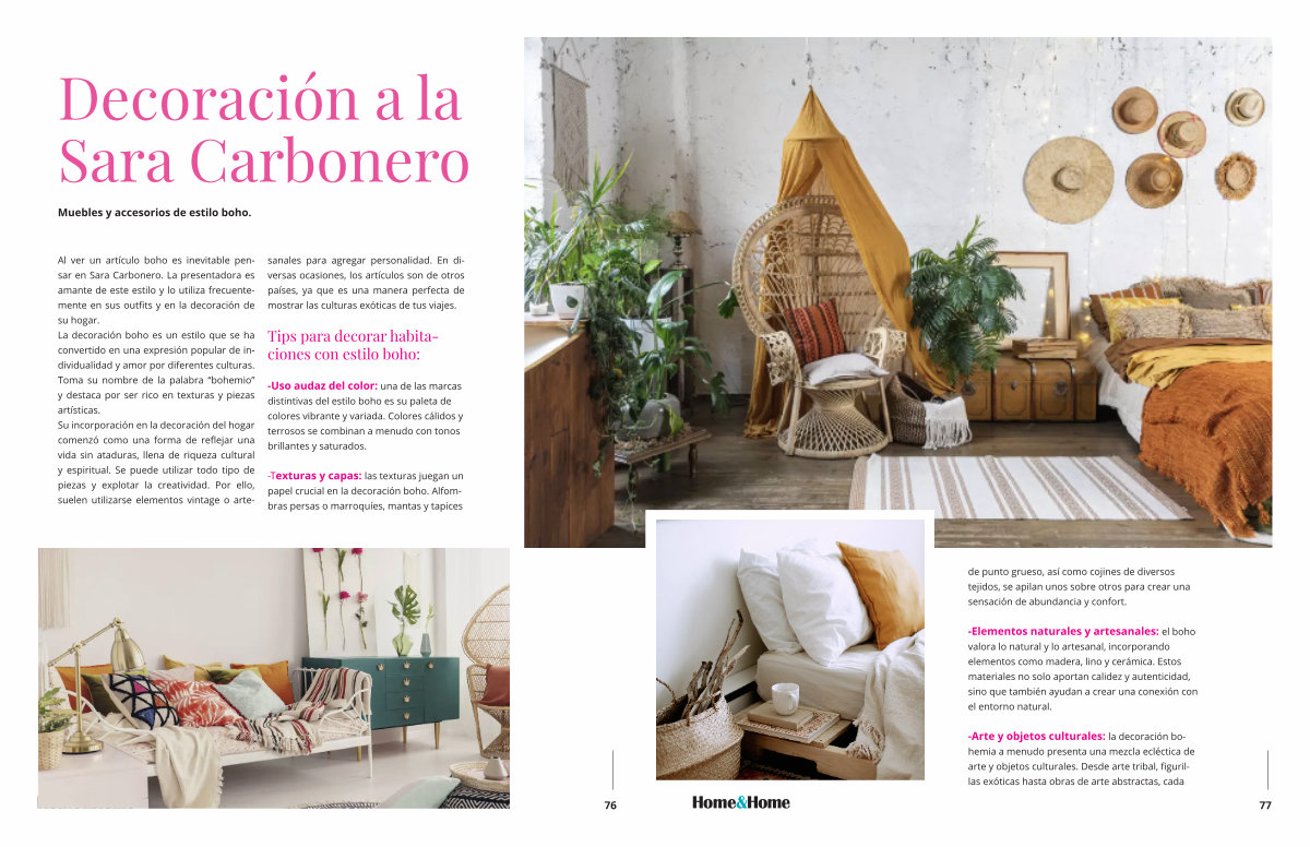 -Elementos naturales y artesanales : el boho valora lo natural y lo artesanal , incorporando elementos como madera , lino y cerámica . Estos materiales no solo aportan calidez y autenticidad , sino que también ayudan a crear una conexión con el entorno natural .