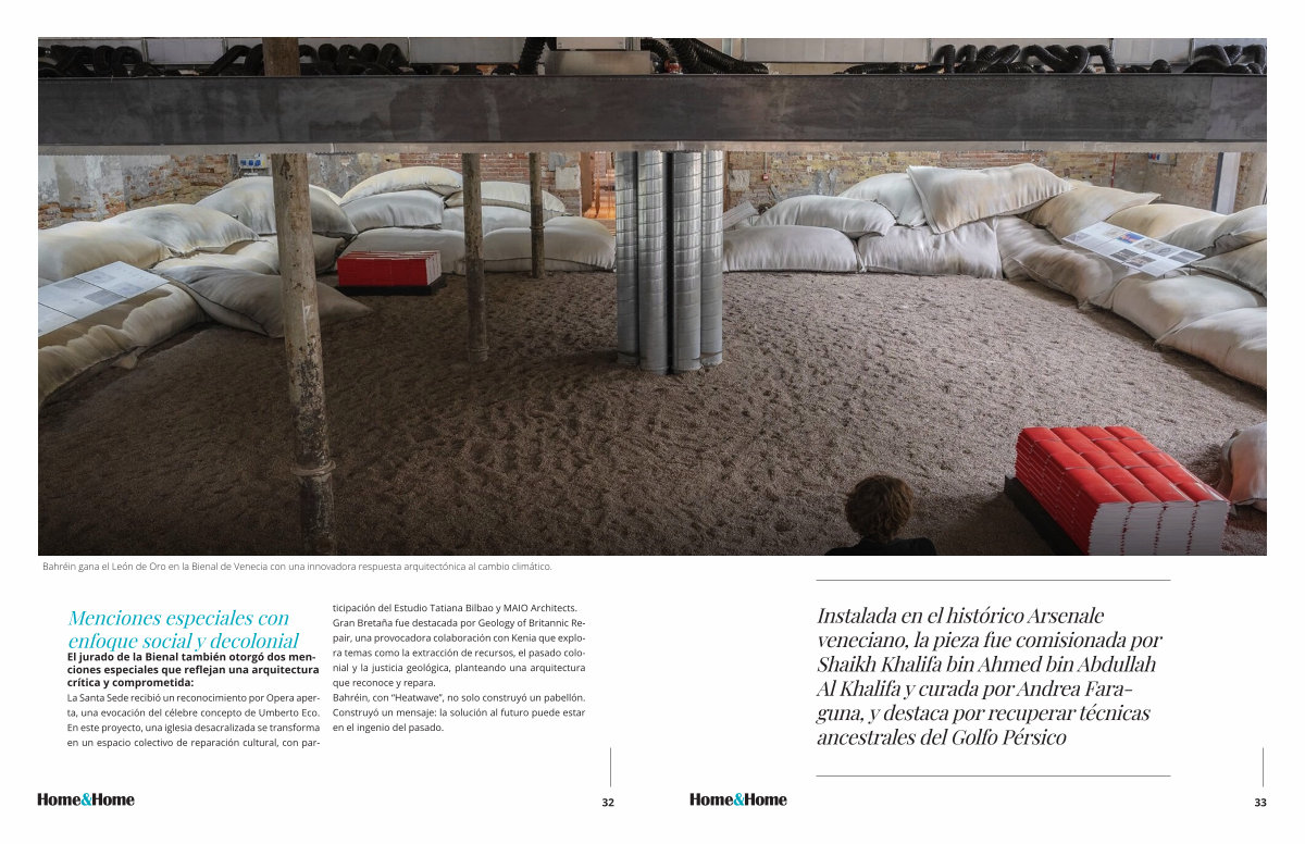 La Santa Sede recibió un reconocimiento por Opera aperta, una evocación del célebre concepto de Umberto Eco. En este proyecto, una iglesia desacralizada se transforma en un espacio colectivo de reparación cultural, con participación del Estudio Tatiana Bilbao y MAIO Architects. Gran Bretaña fue destacada por Geology of Britannic Repair, una provocadora colaboración con Kenia que explora temas como la extracción de recursos, el pasado colonial y la justicia geológica, planteando una arquitectura que reconoce y repara. Bahréin, con“ Heatwave”, no solo construyó un pabellón. Construyó un mensaje: la solución al futuro puede estar en el ingenio del pasado.