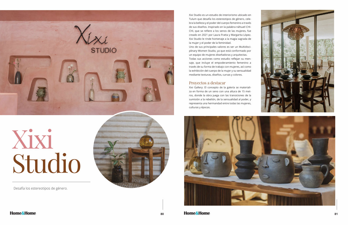 Xixi Studio es un estudio de interiorismo ubicado en Tulum que desafía los estereotipos de género , celebra la belleza y el poder del cuerpo femenino a través de sus diseños . Inspirado en la palabra náhuatl CHI- CHI , que se refiere a los senos de las mujeres , fue creado en 2021 por Laura Fratta y Margarita López . Xixi Studio le rinde homenaje a la magia sagrada de la mujer y el poder de la feminidad . Uno de sus principales valores es ser un Multidisciplinary Women Studio , ya que está conformado por un equipo de mujeres diseñadoras y arquitectas . Todas sus acciones como estudio reflejan su mensaje , que incluye el empoderamiento femenino a través de su forma de trabajo con mujeres , así como la exhibición del cuerpo de la mujer y su sensualidad mediante texturas , diseños , curvas y colores .