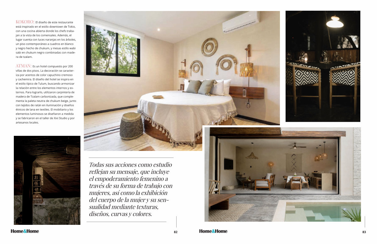 ATMAN : Es un hotel compuesto por 200 villas de dos pisos . La decoración se caracteriza por acentos de color capuchino cremoso y cachemira . El diseño del hotel se inspira en el estilo típico de Tulum , buscando armonizar la relación entre los elementos internos y externos . Para lograrlo , utilizaron carpintería de madera de Tzalam carbonizada , que complementa la paleta neutra de chukum beige , junto con tejidos de ratán en iluminación y diseños étnicos de lana en textiles . El mobiliario y los elementos luminosos se diseñaron a medida y se fabricaron en el taller de Xixi Studio y por artesanos locales .