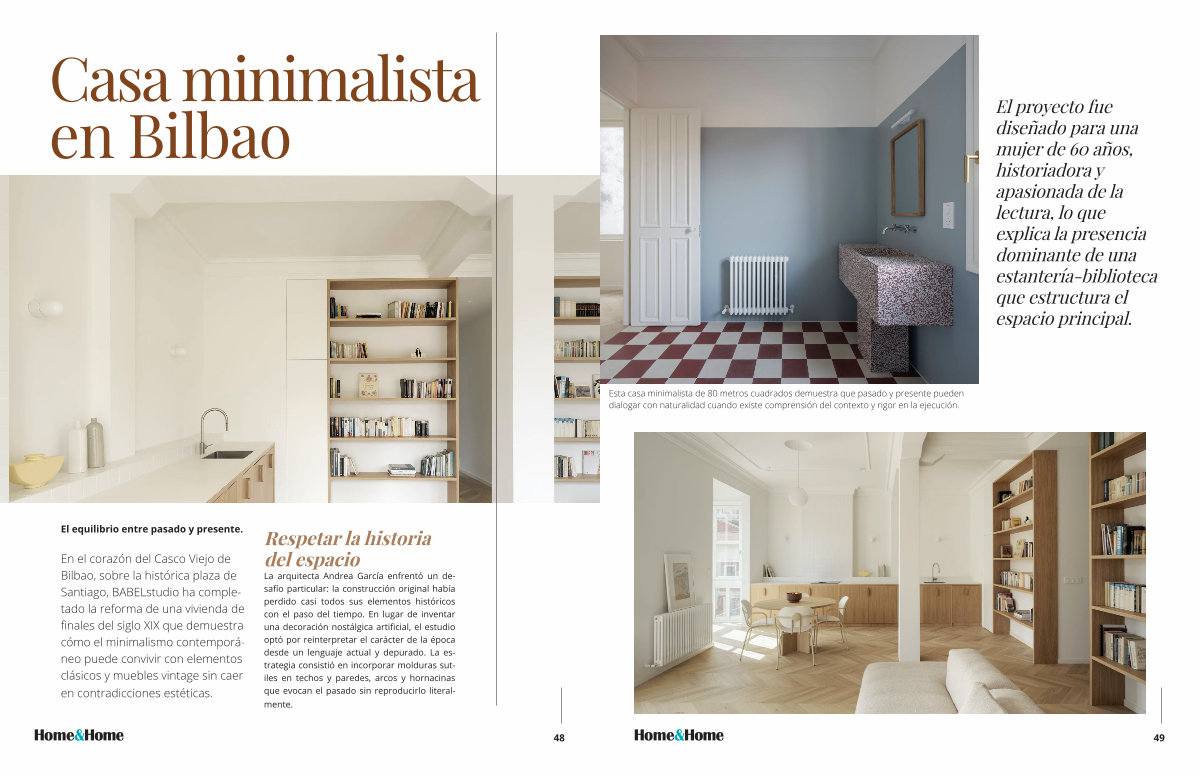 En el corazón del Casco Viejo de Bilbao, sobre la histórica plaza de Santiago, BABELstudio ha completado la reforma de una vivienda de finales del siglo XIX que demuestra cómo el minimalismo contemporáneo puede convivir con elementos clásicos y muebles vintage sin caer en contradicciones estéticas.