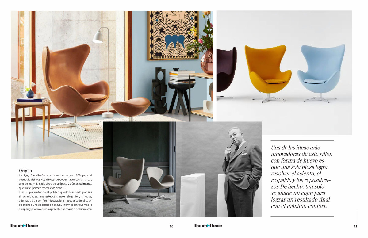 La ‘ Egg ’ fue diseñada expresamente en 1958 para el vestíbulo del SAS Royal Hotel de Copenhague ( Dinamarca ), uno de los más exclusivos de la época y aún actualmente , que fue el primer rascacielos danés . Tras su presentación el público quedó fascinado por sus singularidades : una estética simple , elegante y sinuosa ; además de un confort inigualable al recoger todo el cuerpo cuando uno se sienta en ella . Sus formas envolventes te atrapan y producen una agradable sensación de bienestar .