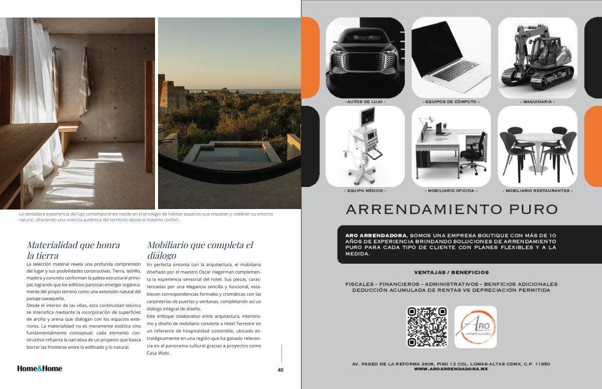 En perfecta sintonía con la arquitectura, el mobiliario diseñado por el maestro Oscar Hagerman complementa la experiencia sensorial del hotel. Sus piezas, caracterizadas por una elegancia sencilla y funcional, establecen correspondencias formales y cromáticas con las carpinterías de puertas y ventanas, completando así un diálogo integral de diseño. Este enfoque colaborativo entre arquitectura, interiorismo y diseño de mobiliario convierte a Hotel Terrestre en un referente de hospitalidad sostenible, ubicado estratégicamente en una región que ha ganado relevancia en el panorama cultural gracias a proyectos como Casa Wabi.