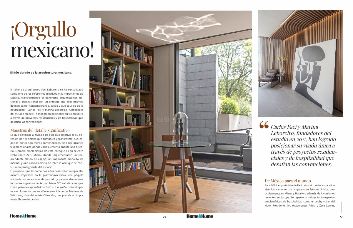 Para 2025, el portafolio de Faci Leboreiro se ha expandido significativamente con proyectos en Estados Unidos, particularmente en Miami y Houston, además de incursiones recientes en Europa. Su repertorio incluye tanto espacios emblemáticos de hospitalidad como el Lobby y bar del Hotel Presidente, los restaurantes Adela y Zeru Lomas,