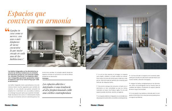 Los baños integrados total o parcialmente en los dormitorios tienen muchos seguidores pero también detractores . Es una solución que genera sensación de amplitud en el dormitorio con una estética moderna , sin embargo hay quien opina que se pierde intimidad . Poder levantarse de la cama e ir directamente al baño hace que nos sintamos como en suite de lujo de un ho- tel de cinco estrellas . El concepto abierto donde los espacios conviven en armonía es una de las últimas tendencias en decoración . Ventajas