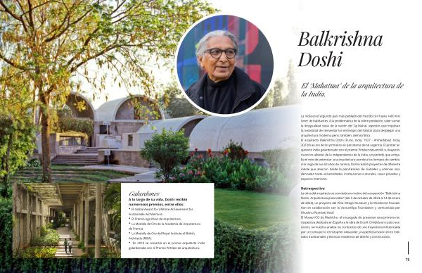 La India es el segundo país más poblado del mundo con hasta 1400 millones de habitantes . A la problemática de la sobre población , cabe sumar la desigualdad social de la nación del Taj Mahal , aspectos que impulsan la necesidad de reinventar los entresijos del habitar para desplegar una arquitectura moderna pero , también , democrática . El arquitecto Balkrishna Doshi ( Pune , India , 1927 - Ahmedabad , India , 2023 ) fue uno de los primeros en percatarse de tal urgencia . El primer arquitecto indio galardonado con el premio Pritzker desarrolló su trayectoria en los albores de la independencia de la India , un período que arrojaba el reto de potenciar una arquitectura acorde a los tiempos de cambio . A lo largo de sus 60 años de carrera , Doshi realizó proyectos de diferente índole que abarcan desde la planificación de ciudades y colonias residenciales hasta universidades , instituciones culturales , casas privadas y espacios interiores .