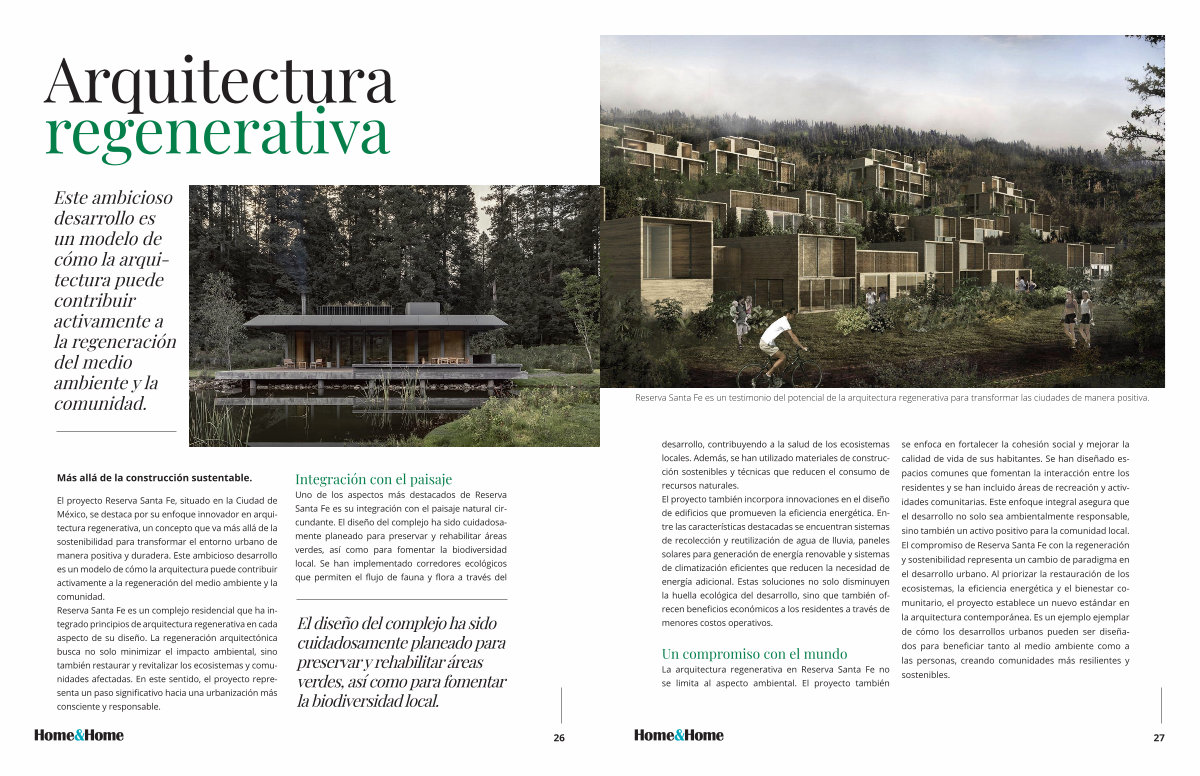 El proyecto Reserva Santa Fe , situado en la Ciudad de México , se destaca por su enfoque innovador en arquitectura regenerativa , un concepto que va más allá de la sostenibilidad para transformar el entorno urbano de manera positiva y duradera . Este ambicioso desarrollo es un modelo de cómo la arquitectura puede contribuir activamente a la regeneración del medio ambiente y la comunidad . Reserva Santa Fe es un complejo residencial que ha integrado principios de arquitectura regenerativa en cada aspecto de su diseño . La regeneración arquitectónica busca no solo minimizar el impacto ambiental , sino también restaurar y revitalizar los ecosistemas y comunidades afectadas . En este sentido , el proyecto representa un paso significativo hacia una urbanización más consciente y responsable .