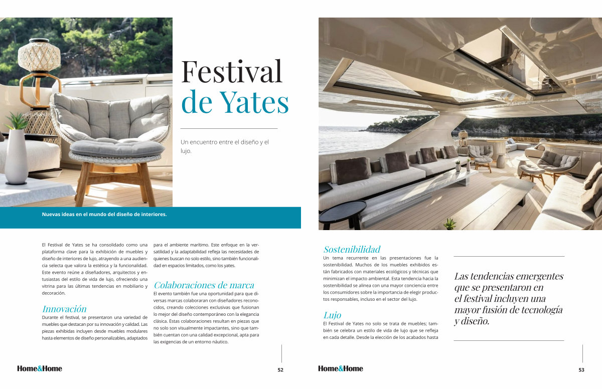 El Festival de Yates se ha consolidado como una plataforma clave para la exhibición de muebles y diseño de interiores de lujo , atrayendo a una audiencia selecta que valora la estética y la funcionalidad . Este evento reúne a diseñadores , arquitectos y entusiastas del estilo de vida de lujo , ofreciendo una vitrina para las últimas tendencias en mobiliario y decoración .