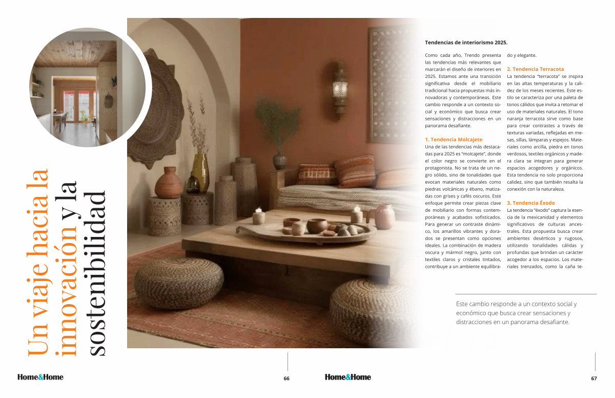 2 . Tendencia Terracota La tendencia “ terracota ” se inspira en las altas temperaturas y la calidez de los meses recientes . Este estilo se caracteriza por una paleta de tonos cálidos que invita a retomar el uso de materiales naturales . El tono naranja terracota sirve como base para crear contrastes a través de texturas variadas , reflejadas en mesas , sillas , lámparas y espejos . Materiales como arcilla , piedra en tonos verdosos , textiles orgánicos y madera clara se integran para generar espacios acogedores y orgánicos . Esta tendencia no solo proporciona calidez , sino que también resalta la conexión con la naturaleza .
