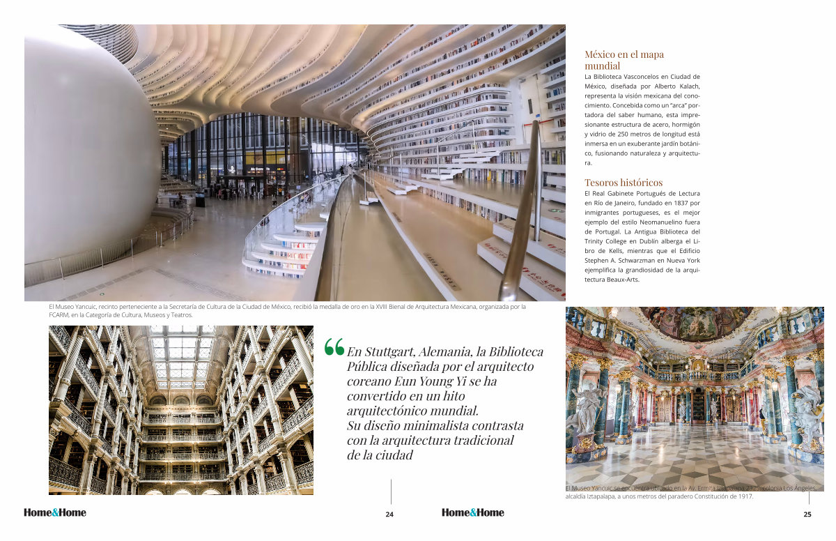 El Real Gabinete Portugués de Lectura en Río de Janeiro, fundado en 1837 por inmigrantes portugueses, es el mejor ejemplo del estilo Neomanuelino fuera de Portugal. La Antigua Biblioteca del Trinity College en Dublín alberga el Libro de Kells, mientras que el Edificio Stephen A. Schwarzman en Nueva York ejemplifica la grandiosidad de la arquitectura Beaux-Arts. rquitectura Mexicana, organizada por la