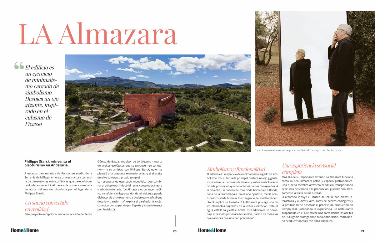 Gómez de Baeza, impulsor de LA Organic— marca de aceites ecológicos que se producen en su interior—, y su amistad con Philippe Starck, quien se planteó una pregunta revolucionaria: ¿ y si el aceite de oliva tuviera su propio templo? La respuesta es este cubo monolítico que combina arquitectura industrial, arte contemporáneo y tradición milenaria.“ LA Almazara es un lugar insólito, increíble y milagroso, donde el visitante puede disfrutar de una experiencia poderosa y radical que desafía y transforma”, explica el diseñador francés, conocido por su pasión por España y especialmente por Andalucía.
