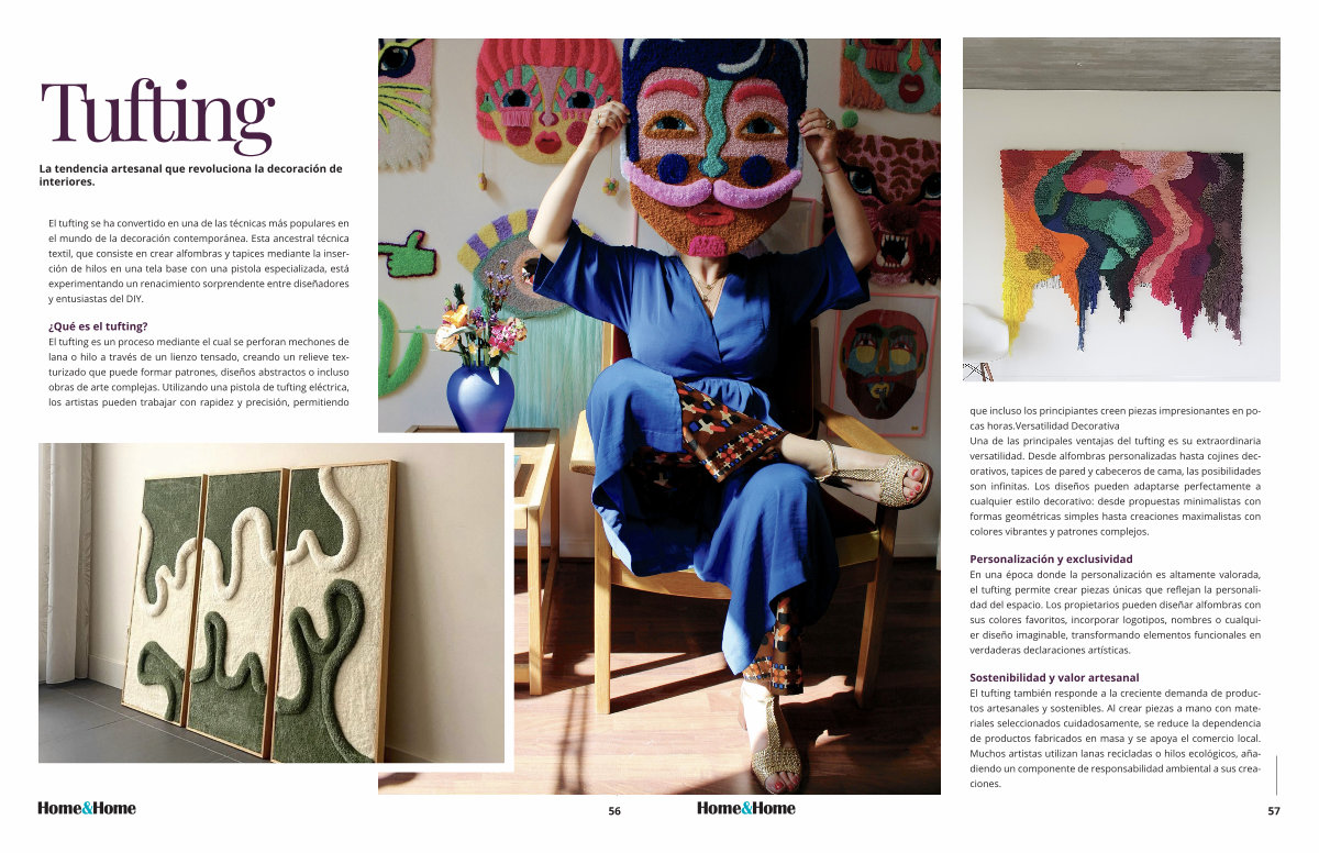 que incluso los principiantes creen piezas impresionantes en pocas horas. Versatilidad Decorativa Una de las principales ventajas del tufting es su extraordinaria versatilidad. Desde alfombras personalizadas hasta cojines decorativos, tapices de pared y cabeceros de cama, las posibilidades son infinitas. Los diseños pueden adaptarse perfectamente a cualquier estilo decorativo: desde propuestas minimalistas con formas geométricas simples hasta creaciones maximalistas con colores vibrantes y patrones complejos.