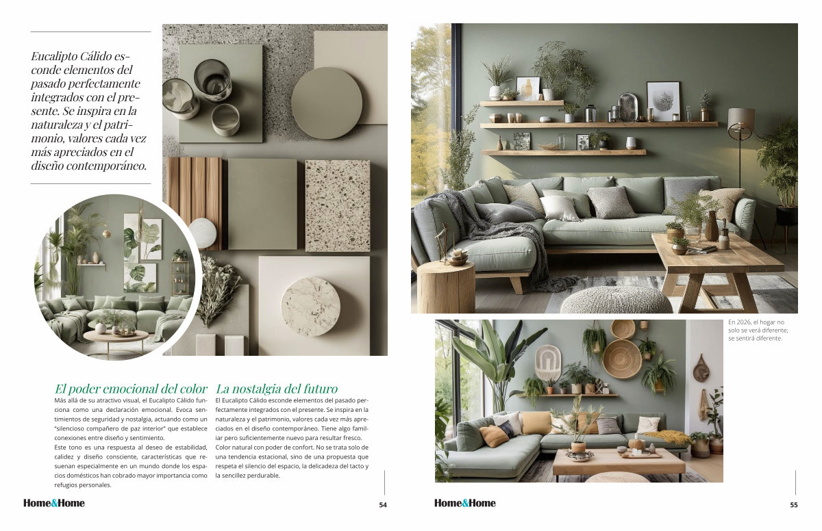Más allá de su atractivo visual, el Eucalipto Cálido funciona como una declaración emocional. Evoca sentimientos de seguridad y nostalgia, actuando como un“ silencioso compañero de paz interior” que establece conexiones entre diseño y sentimiento. Este tono es una respuesta al deseo de estabilidad, calidez y diseño consciente, características que resuenan especialmente en un mundo donde los espacios domésticos han cobrado mayor importancia como refugios personales.