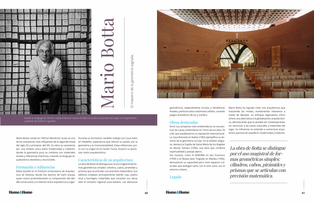 Mario Botta, nacido en 1943 en Mendrisio, Suiza, es uno de los arquitectos más influyentes de la segunda mitad del siglo XX y principios del XXI. Su obra se caracteriza por una síntesis única entre modernidad y tradición, donde la geometría pura se combina con materiales locales y referencias históricas, creando un lenguaje arquitectónico distintivo y reconocible.