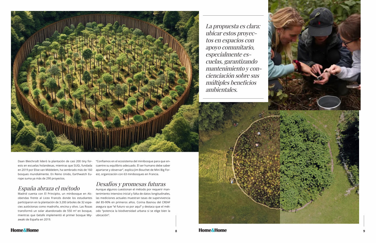 Madrid cuenta con El Principito, un minibosque en Alcobendas frente al Liceo Francés donde los estudiantes participaron en la plantación de 3.200 árboles de 32 especies autóctonas como madroño, encina y olivo. Las Rozas transformó un solar abandonado de 550 m ² en bosque, mientras que Getafe implementó el primer bosque Miyawaki de España en 2019.