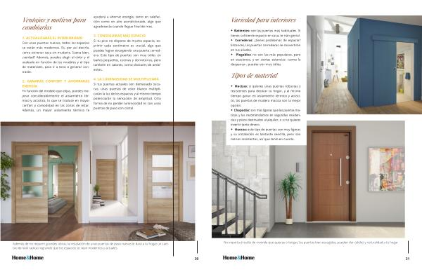 1 . ACTUALIZARÁS EL INTERIORISMO Con unas puertas nuevas , todos los espacios se verán más modernos . Es , por así decirlo , como estrenar casa sin mudarte . Suena bien , ¿ verdad ? Además , puedes elegir el color y el acabado en función de los muebles y el tipo de materiales , para ir a tono o generar contraste .