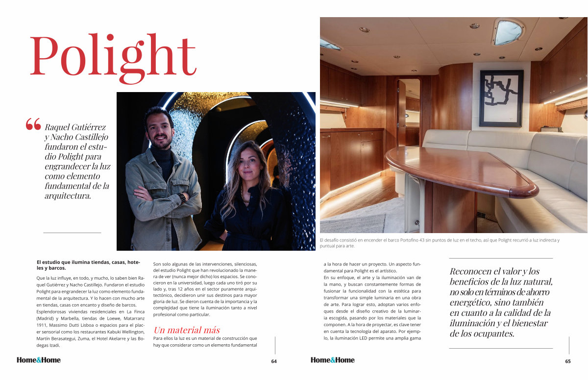 Que la luz influye , en todo , y mucho , lo saben bien Raquel Gutiérrez y Nacho Castillejo . Fundaron el estudio Polight para engrandecer la luz como elemento fundamental de la arquitectura . Y lo hacen con mucho arte en tiendas , casas con encanto y diseño de barcos . Esplendorosas viviendas residenciales en La Finca ( Madrid ) y Marbella , tiendas de Loewe , Matarranz 1911 , Massimo Dutti Lisboa o espacios para el placer sensorial como los restaurantes Kabuki Wellington , Martín Berasategui , Zuma , el Hotel Akelarre y las Bodegas Izadi .
