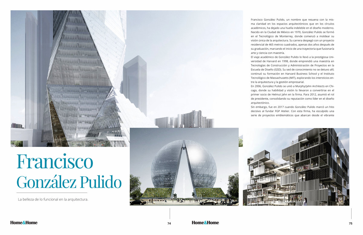 Francisco González Pulido , un nombre que resuena con la misma claridad en los espacios arquitectónicos que en los círculos académicos , ha dejado una huella indeleble en el diseño moderno . Nacido en la Ciudad de México en 1970 , González Pulido se formó en el Tecnológico de Monterrey , donde comenzó a moldear su visión única de la arquitectura . Su carrera despegó con un proyecto residencial de 465 metros cuadrados , apenas dos años después de su graduación , marcando el inicio de una trayectoria que fusionaría arte y ciencia con maestría . El viaje académico de González Pulido lo llevó a la prestigiosa Universidad de Harvard en 1998 , donde emprendió una maestría en Tecnologías de Construcción y Administración de Proyectos en la Escuela de Diseño ( GSD ). Su sed de conocimiento no se detuvo allí ; continuó su formación en Harvard Business School y el Instituto Tecnológico de Massachusetts ( MIT ), explorando los intersticios entre la arquitectura y la gestión empresarial . En 2006 , González Pulido se unió a Murphy / Jahn Architects en Chicago , donde su habilidad y visión lo llevaron a convertirse en el primer socio de Helmut Jahn en la firma . Para 2012 , asumió el rol de presidente , consolidando su reputación como líder en el diseño arquitectónico . Sin embargo , fue en 2017 cuando González Pulido marcó un hito decisivo al fundar FGP Atelier . Con esta firma , ha esculpido una serie de proyectos emblemáticos que abarcan desde el vibrante