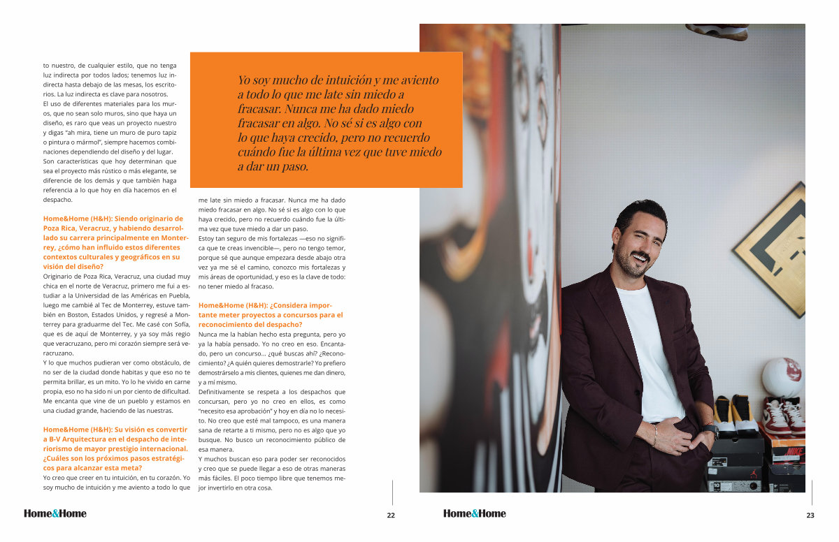 Home & Home( H & H): Su visión es convertir a B-V Arquitectura en el despacho de interiorismo de mayor prestigio internacional. ¿ Cuáles son los próximos pasos estratégicos para alcanzar esta meta? Yo creo que creer en tu intuición, en tu corazón. Yo soy mucho de intuición y me aviento a todo lo que me late sin miedo a fracasar. Nunca me ha dado miedo fracasar en algo. No sé si es algo con lo que haya crecido, pero no recuerdo cuándo fue la última vez que tuve miedo a dar un paso. Estoy tan seguro de mis fortalezas— eso no significa que te creas invencible—, pero no tengo temor, porque sé que aunque empezara desde abajo otra vez ya me sé el camino, conozco mis fortalezas y mis áreas de oportunidad, y eso es la clave de todo: no tener miedo al fracaso.