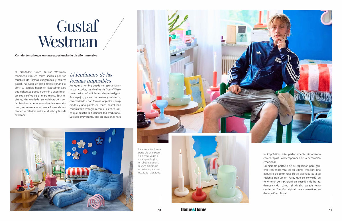 Aunque su nombre pueda no resultar familiar para todos, los diseños de Gustaf Westman son inconfundibles en el mundo digital. Sus espejos, platos, portavelas y revisteros, caracterizados por formas orgánicas exageradas y una paleta de tonos pastel, han conquistado Instagram con su estética lúdica que desafía la funcionalidad tradicional. Su estilo irreverente, que en ocasiones roza