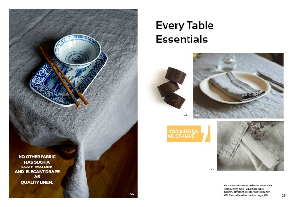 01. Linen tablecloth, different sizes and colors, from €115 02. Linen table napkin, different colors, 45x45cm, €9. 03. Natural leather napkin rings, €8.
