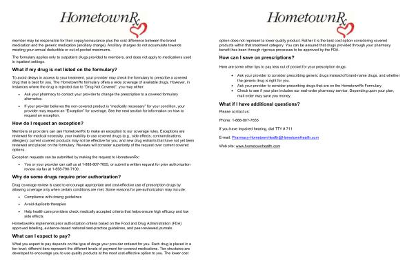 Members or providers can ask HometownRx to make an exception to our coverage rules . Exceptions are reviewed for medical necessity , your inability to use covered drugs ( e . g ., side effects , contraindications , allergies ), current covered products may not be effective for you , and new drug entrants that have not yet been reviewed and placed on the formulary . Reviews will consider superiority of the request over current covered options .