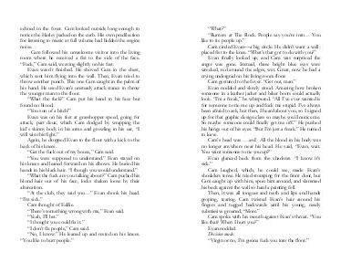 “ I’ m sick.” Cam thought of Eddie.“ There’ s something wrong with me,” Evan said.“ Yeah, I’ ll bet.”“ I thought you could fix it.”“ I don’ t fix people,” Cam said.“ No, I know.” He leaned up and rested on his knees.