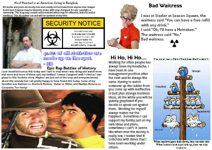 All stories and posts are mostly true and usually not borrowed from anyone else. Images found here however may be blatently stolen with total disregard for any copyright or ownership. This blog may contain adult material which may be offensive, immoral and/or unethical. This disclaimer can and will be updated at any time.
