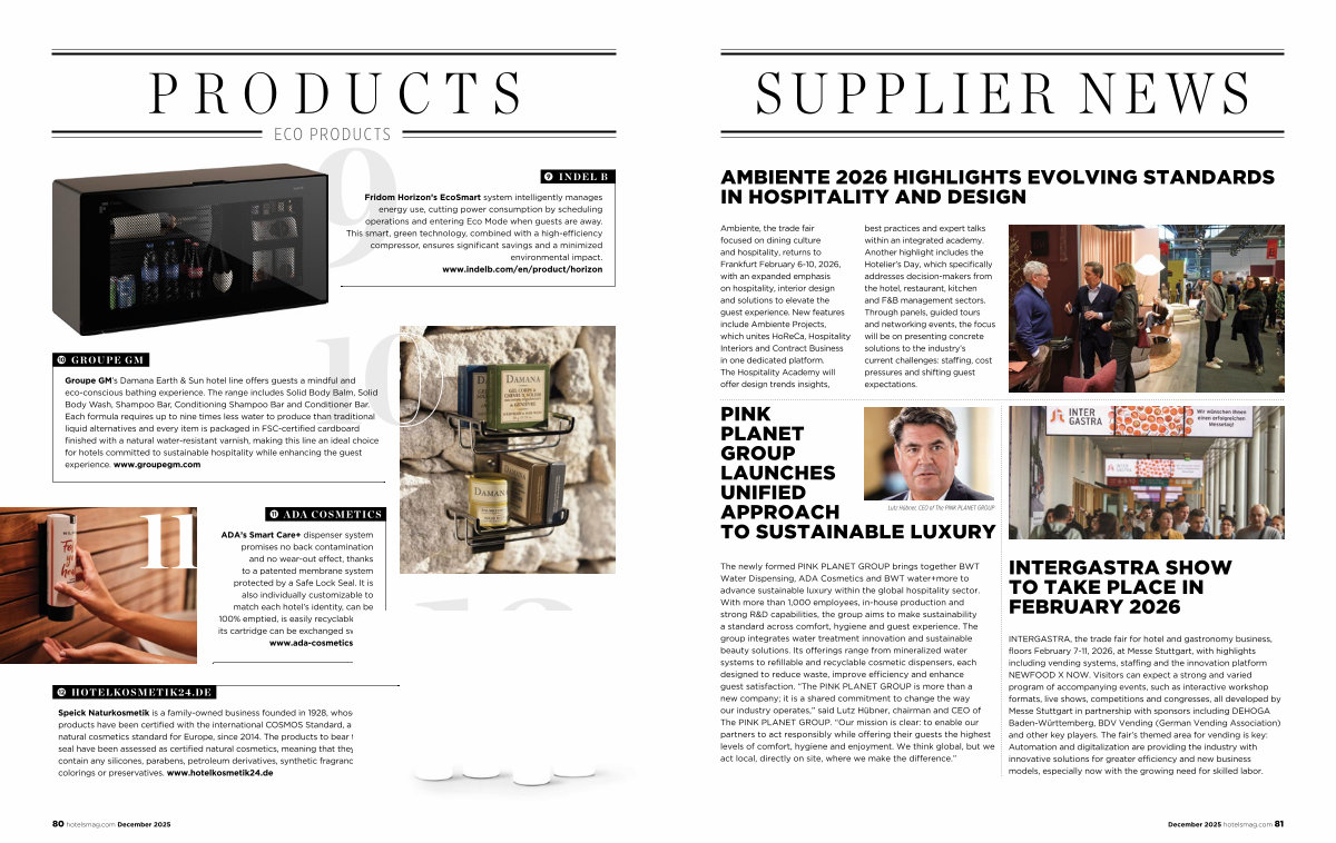 ADA’ s Smart Care + dispenser system promises no back contamination and no wear-out effect, thanks to a patented membrane system protected by a Safe Lock Seal. It is also individually customizable to match each hotel’ s identity, can be 100 % emptied, is easily recyclable and its cartridge can be exchanged swiftly. www. ada-cosmetics. com
