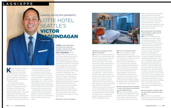 HOTELS : Lotte Hotel Seattle opened last year amid the pandemic . How has the hotel ’ s performance been so far ? Victor Caguindagan : On the business front , we have seen our occupancy steadily improving and have seen increased production from varying segments as some travel restrictions decline . The hotel has gained a long list of recognitions since opening over a year ago . We were awarded Top Ten Best New Hotels in the U . S . by the readers of USA Today . We became the number one hotel on Tripadvisor seven months after we opened . We were also the first hotel in Seattle and Washington State to be certified by Forbes and Sharecare on our health and security practices against COVID-19 . Earlier this year , we were chosen as the most romantic hotel in Seattle and have also been certified as a Great Place to Work . Most recently , we landed on Top 10 Best Hotels in the Pacific Northwest by the readers of Condé Nast Traveler .