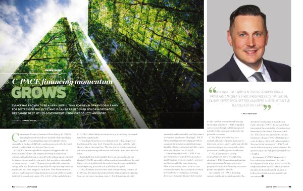 C-PACE is a financing vehicle adopted and approved in 38 states plus the District of Columbia by which developers of commercial real estate can secure attractive financing investments for improvements made to a property that provides a sustainable or “ green-energy ” benefit . The project is qualified by a standard energy audit and then funds are provided for sponsorship based on regulations and rules unique to each state . This debt instrument acts as a tax lien and servicing payments are made at the propertytax level . If a developer can do 30 % to 40 % of the capital stack at