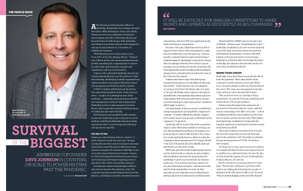 MAKING TOUGH CHOICES Aimbridge is big , but it hasn ’ t escaped side effects from the pandemic . More than 40,000 of the company ’ s 62,000 employees were laid off last year , a decision Johnson calls one of the hardest of his career . The corporate management team also took a 20 % pay cut for the last half of 2020 .