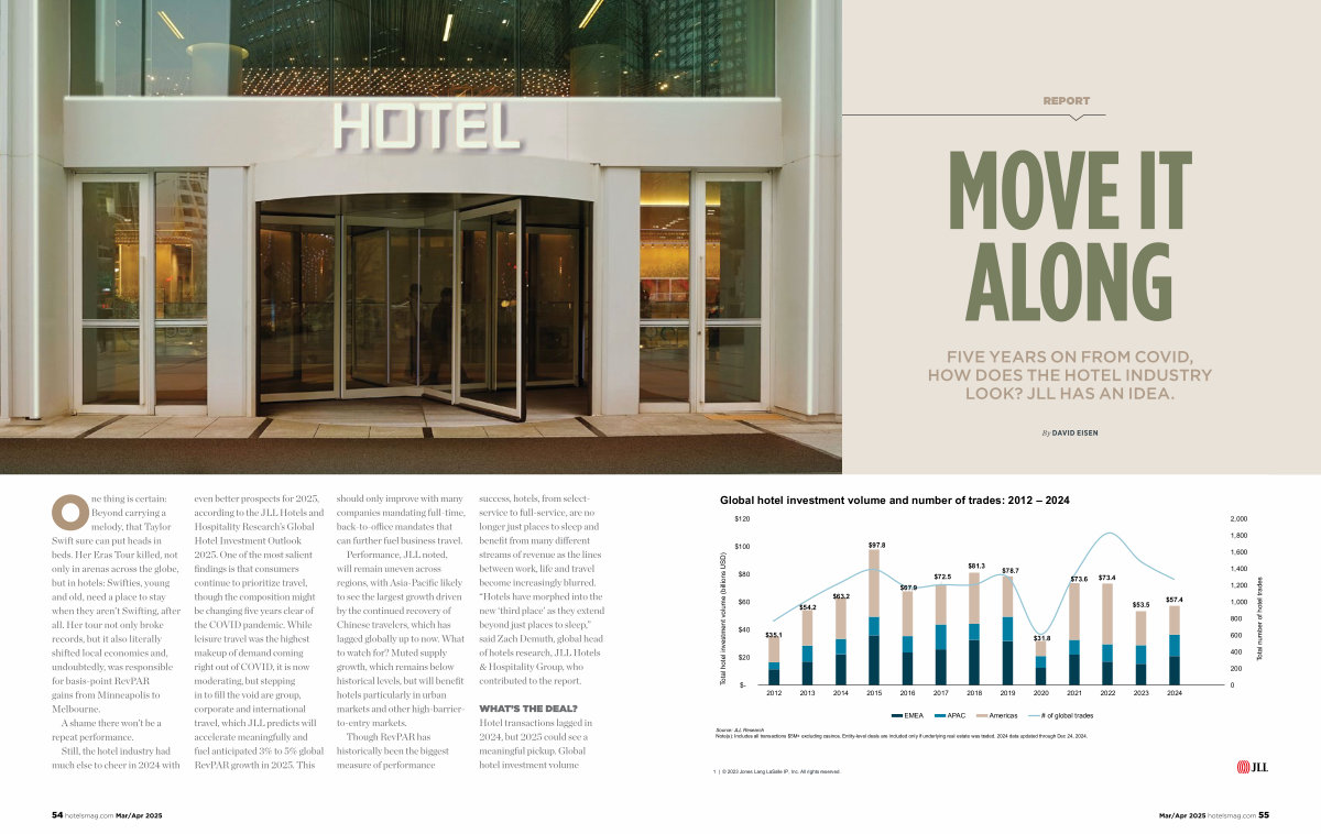 WHAT ’ S THE DEAL ? Hotel transactions lagged in 2024 , but 2025 could see a meaningful pickup . Global hotel investment volume