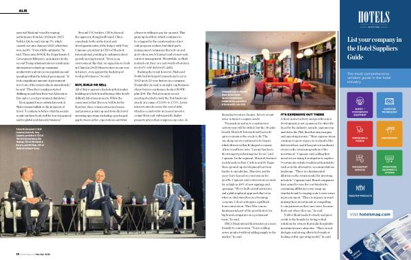 BUY, BUILD OR SELL All of this is against a backdrop that makes building new hotels and buying older hotels difficult, laborious projects. While the consensus is that this year will be better than last, there remain structural issues and pressure points up and down the hotel investing spectrum, including a prolonged gap between seller expectations and what a buyer is willing to pay for an asset. This gums up deal flow, which continues to be a laggard to the consternation of not only property seekers, but third-party management companies that rely on and grow when assets transact and owners seek out new management. Meanwhile, as Shah pointed out, there is a vast swath of hotels in need of Covid-deferred CapEx.
