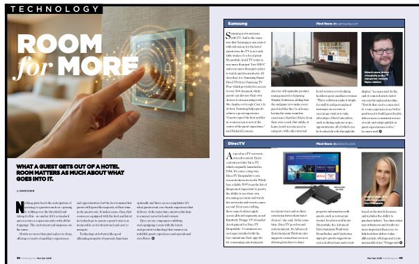 As good as a TV screen is, it needs content. Enter content provider DirecTV, which originally launched in 1994. It’ s come a long way. DirecTV Hospitality’ s own research shows its worth: While fast, reliable WiFi tops the list of things most important to guests, the ability to use their own streaming accounts and watch live networks and events comes second. Even more telling, these same features apply across all hotel segments, noted Kimberly Twiggs, VP of market development for DirecTV Hospitality.“ Consumers are no longer satisfied with the bare minimum; their appetite for consuming entertainment |