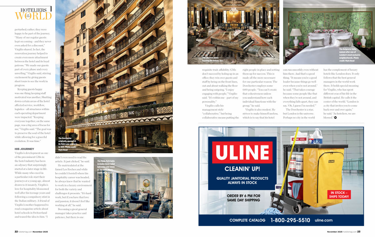 has the complement of luxury hotels like London does. It only follows that the best general managers in the world work there. It holds special meaning for Virgilio, who has spent different eras of his life in the British capital. He calls it the center of the world.“ London is a city that invites you to come back over and over again,” he said.“ As hoteliers, we are blessed.” |