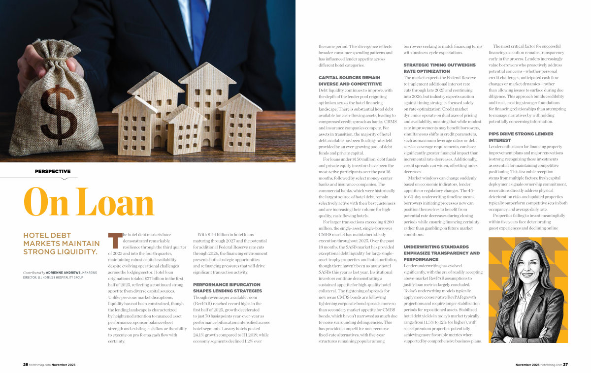 The hotel debt markets have demonstrated remarkable resilience through the third quarter of 2025 and into the fourth quarter, maintaining robust capital availability despite evolving operational challenges across the lodging sector. Hotel loan originations totaled $ 27 billion in the first half of 2025, reflecting a continued strong appetite from diverse capital sources. Unlike previous market disruptions, liquidity has not been constrained, though the lending landscape is characterized by heightened attention to nuanced asset performance, sponsor balance sheet strength and existing cash flow or the ability to execute on pro forma cash flow with certainty.
