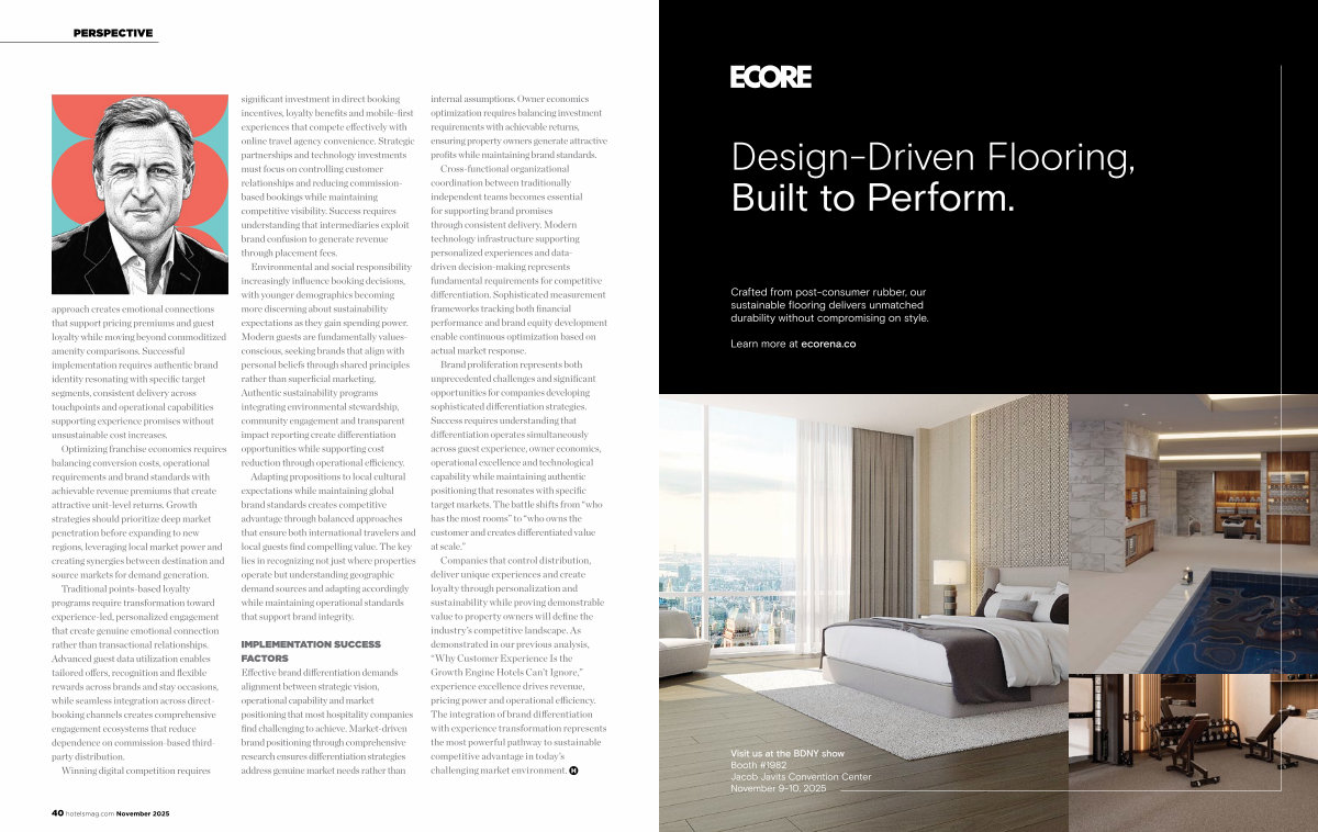 Brand proliferation represents both unprecedented challenges and significant opportunities for companies developing sophisticated differentiation strategies. Success requires understanding that differentiation operates simultaneously across guest experience, owner economics, operational excellence and technological capability while maintaining authentic positioning that resonates with specific target markets. The battle shifts from“ who has the most rooms” to“ who owns the customer and creates differentiated value at scale.”