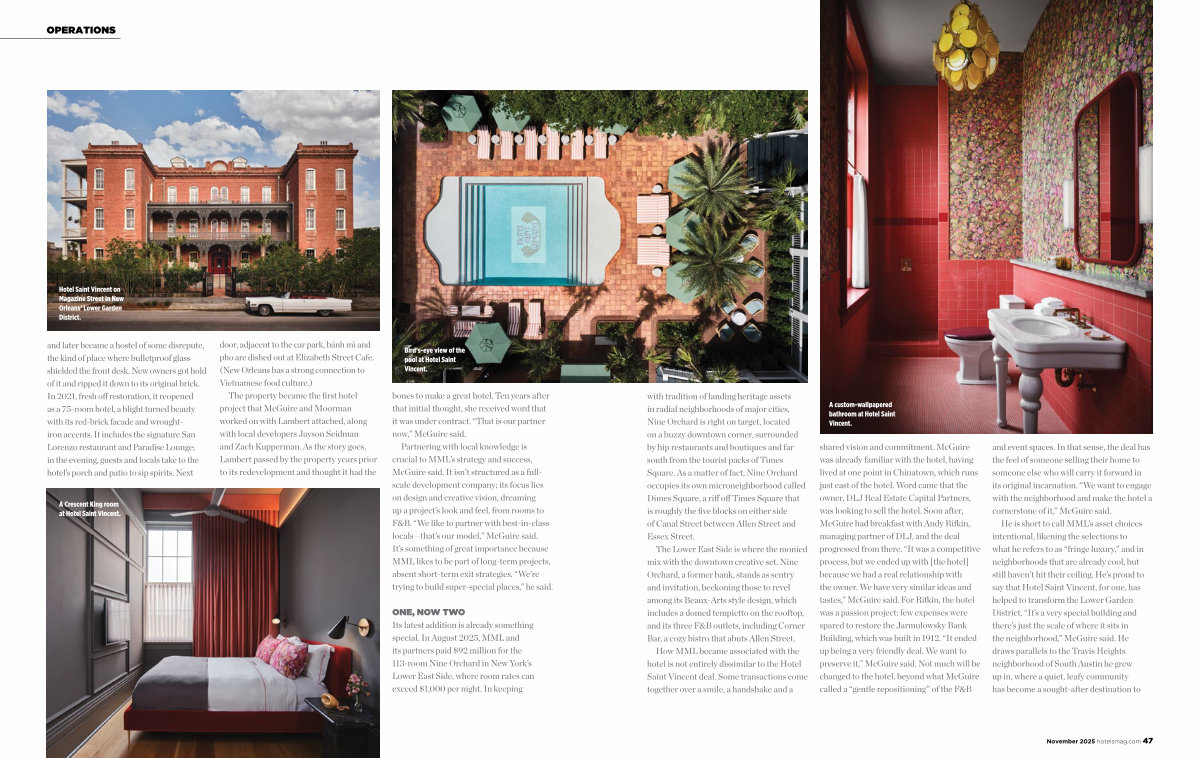 He is short to call MML’ s asset choices intentional, likening the selections to what he refers to as“ fringe luxury,” and in neighborhoods that are already cool, but still haven’ t hit their ceiling. He’ s proud to say that Hotel Saint Vincent, for one, has helped to transform the Lower Garden District.“ It’ s a very special building and there’ s just the scale of where it sits in the neighborhood,” McGuire said. He draws parallels to the Travis Heights neighborhood of South Austin he grew up in, where a quiet, leafy community has become a sought-after destination to