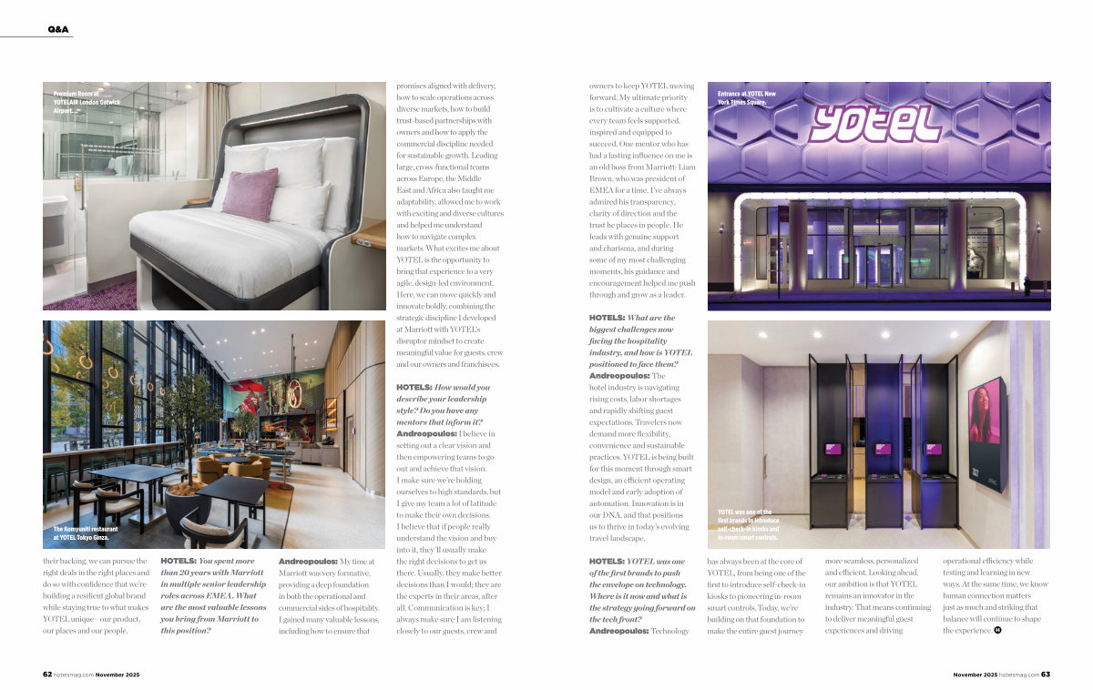 promises aligned with delivery, how to scale operations across diverse markets, how to build trust-based partnerships with owners and how to apply the commercial discipline needed for sustainable growth. Leading large, cross-functional teams across Europe, the Middle East and Africa also taught me adaptability, allowed me to work with exciting and diverse cultures and helped me understand how to navigate complex markets. What excites me about YOTEL is the opportunity to bring that experience to a very agile, design-led environment. Here, we can move quickly and innovate boldly, combining the strategic discipline I developed at Marriott with YOTEL’ s disruptor mindset to create meaningful value for guests, crew and our owners and franchisees. |