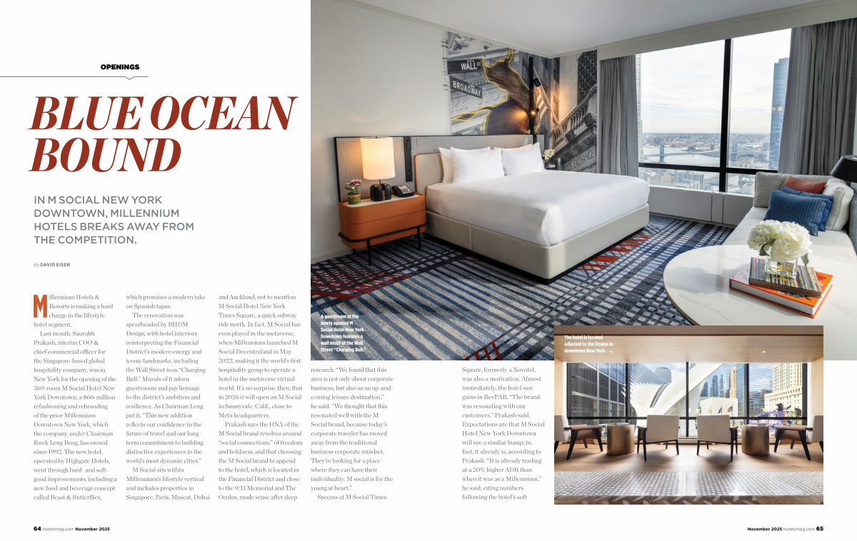 Square, formerly a Novotel, was also a motivation. Almost immediately, the hotel saw gains in RevPAR.“ The brand was resonating with our customers,” Prakash said. Expectations are that M Social Hotel New York Downtown will see a similar bump; in. fact, it already is, according to Prakash.“ It is already trading at a 20 % higher ADR than when it was as a Millennium,” he said, citing numbers following the hotel’ s soft