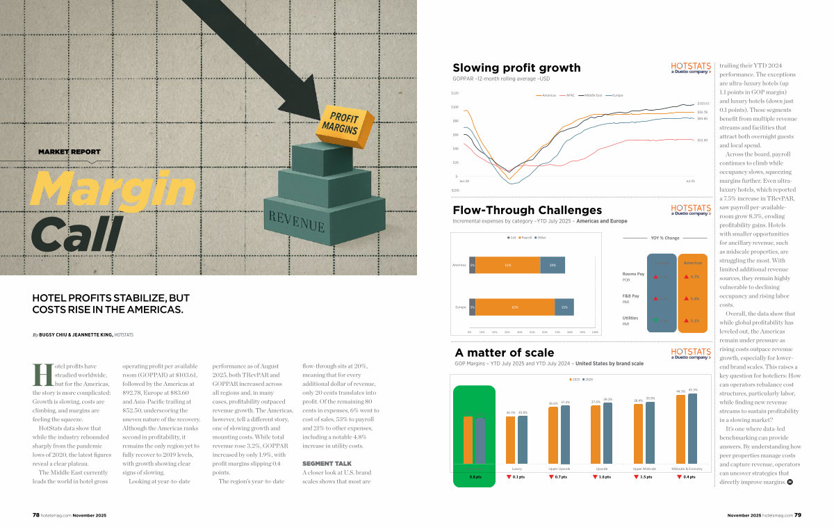 Overall, the data show that while global profitability has leveled out, the Americas remain under pressure as rising costs outpace revenue growth, especially for lowerend brand scales. This raises a key question for hoteliers: How can operators rebalance cost structures, particularly labor, while finding new revenue streams to sustain profitability in a slowing market?