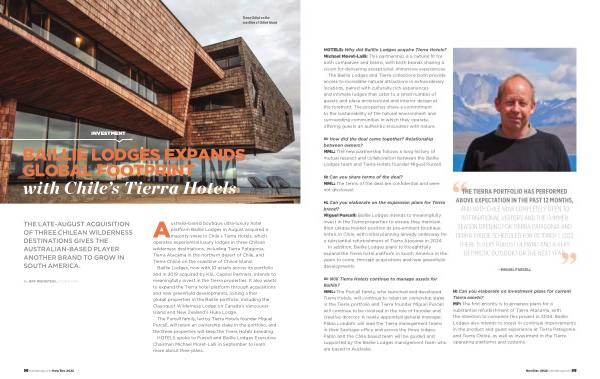 H : Will Tierra Hotels continue to manage assets for Baillie ? MML : The Purcell family , who launched and developed Tierra Hotels , will continue to retain an ownership stake in the Tierra portfolio and Tierra founder Miguel Purcell will continue to be involved in the role of founder and creative director . A newly appointed general manager , Pablo Lundahl , will lead the Tierra management teams in their Santiago office and across the three lodges . Pablo and the Chile based team will be guided and supported by the Baillie Lodges management team who are based in Australia .
