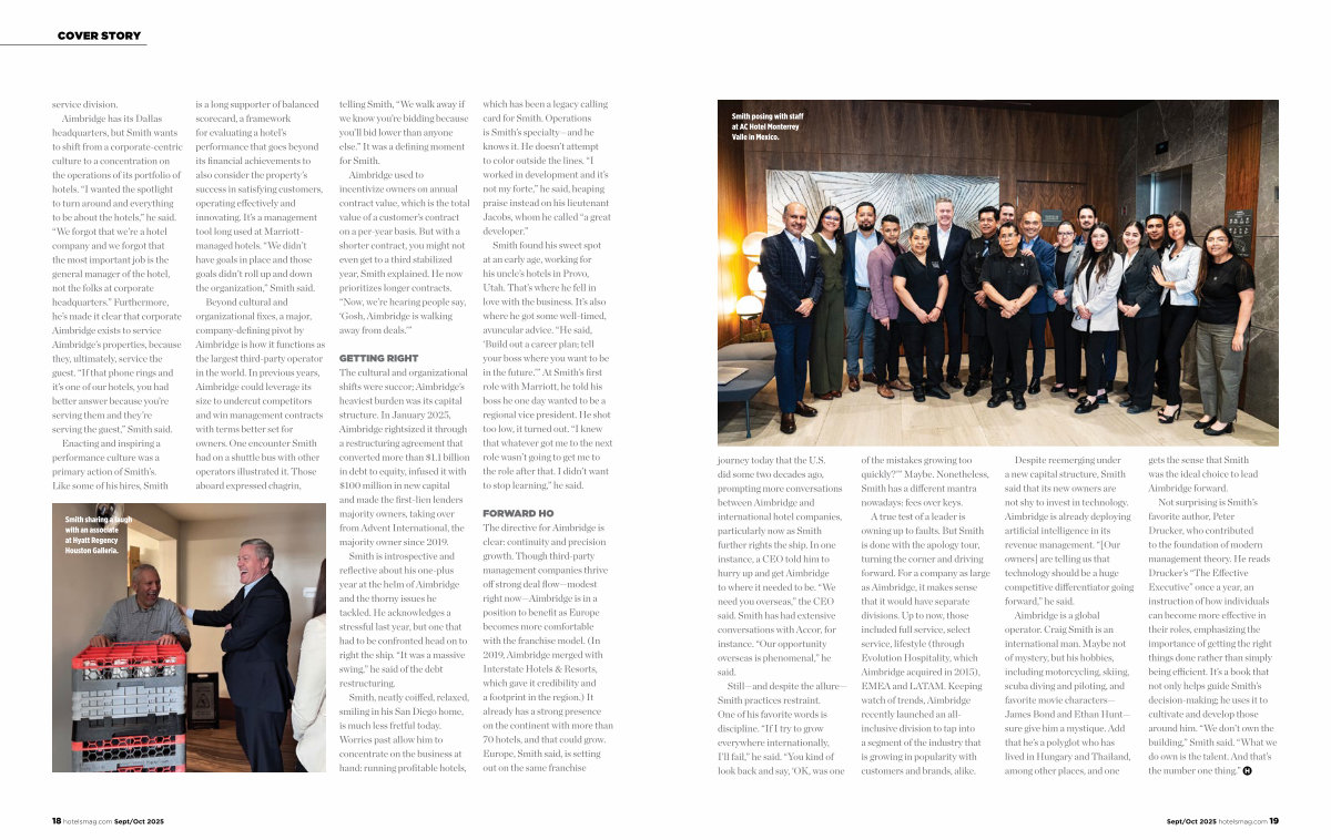 service division. Aimbridge has its Dallas headquarters, but Smith wants to shift from a corporate-centric culture to a concentration on the operations of its portfolio of hotels.“ I wanted the spotlight to turn around and everything to be about the hotels,” he said.“ We forgot that we’ re a hotel company and we forgot that the most important job is the general manager of the hotel, not the folks at corporate headquarters.” Furthermore, he’ s made it clear that corporate Aimbridge exists to service Aimbridge’ s properties, because they, ultimately, service the guest.“ If that phone rings and it’ s one of our hotels, you had better answer because you’ re serving them and they’ re serving the guest,” Smith said.