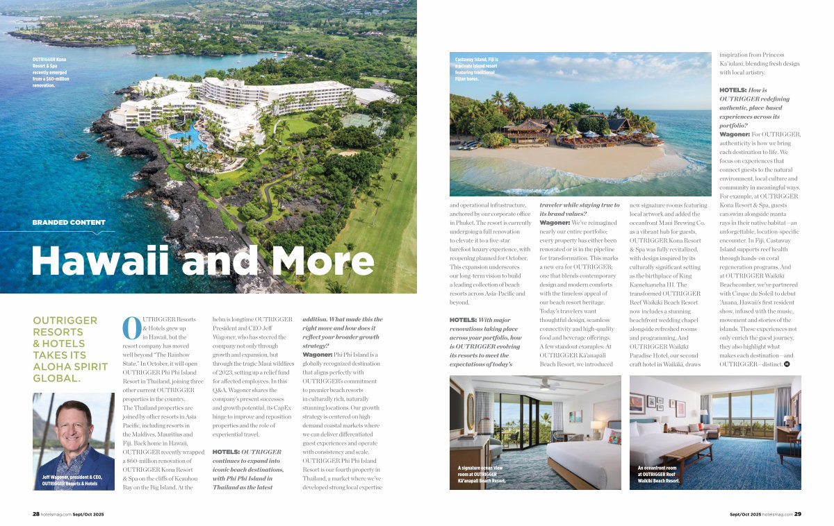 helm is longtime OUTRIGGER President and CEO Jeff Wagoner, who has steered the company not only through growth and expansion, but through the tragic Maui wildfires of 2023, setting up a relief fund for affected employees. In this Q & A, Wagoner shares the company’ s present successes and growth potential, its CapEx binge to improve and reposition properties and the role of experiential travel.