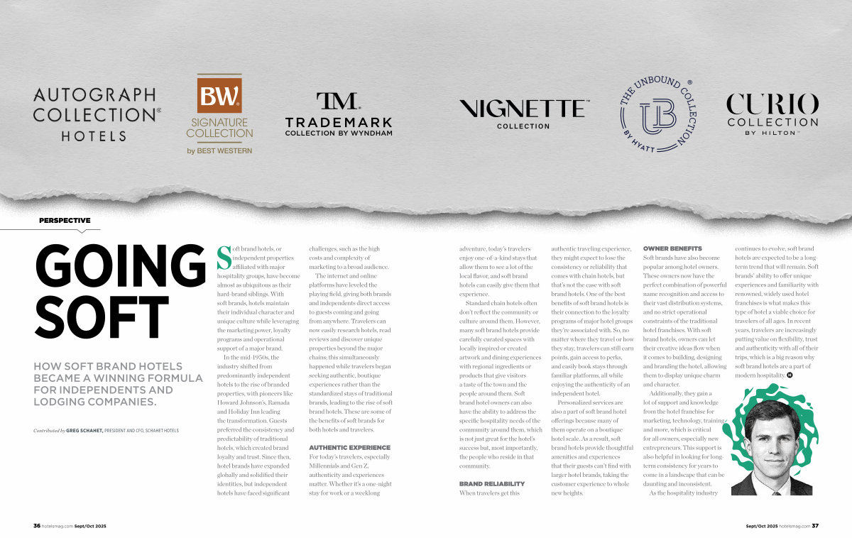 continues to evolve, soft brand hotels are expected to be a longterm trend that will remain. Soft brands’ ability to offer unique experiences and familiarity with renowned, widely used hotel franchises is what makes this type of hotel a viable choice for travelers of all ages. In recent years, travelers are increasingly putting value on flexibility, trust and authenticity with all of their trips, which is a big reason why soft brand hotels are a part of modern hospitality. |