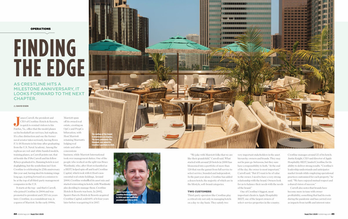 James Carroll, the president and CEO of Crestline Hotels & Resorts, is quick to remind visitors to his Fairfax, Va., office that the model planes on his bookshelf are not toys, but replicas. It’ s a fine distinction and one the former naval aviator takes seriously, having flown F / A-18 Hornets in his time after graduating from the U. S. Naval Academy. Among the replicas are red-and-white banded models, training planes, as Carroll points out, that sit beside the F18s Carroll and his fellow flyboys graduated to. Running hotels is not dogfighting, but the symbolism isn’ t lost: Crestline is celebrating its 25th anniversary this year and, having shed its training wings long ago, is jetting forward on a mission to be at the top of all third-party management companies in the U. S.
