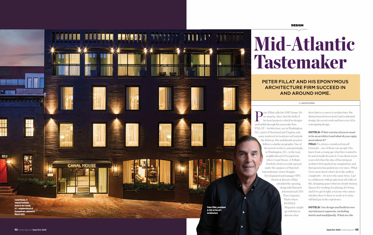 Peter Fillat calls the DMV home. It’ s no surprise, then, that the bulk of his hotel projects, which he designs and builds through his namesake firm FILLAT + Architecture, are in Washington, D. C., parts of Maryland and Virginia, and some scattered in locations well outside the Beltway. His multifamily practice follows a similar geography. One of his newest works is, unsurprisingly, in Washington, D. C., in the tony neighborhood of Georgetown, where Canal House, A Tribute Portfolio Hotel recently opened under the auspices of Marriott