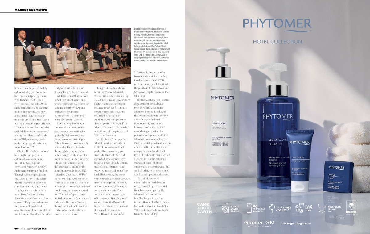 Ron Stewart, SVP of lodging development for midscale brands North America for Marriott International, said that when developers propose a site for extended-stay development,“ we put our lens on it and see what fits,” considering variables like potential occupancy and LOS. Marriott uses companies like Buxton, which provides location and marketing intelligence so companies can decide what types of real estate may succeed. He’ s bullish on the extendedstay asset class:“ It drives success and better margins,” he said, alluding to its streamlined and limited operational model.